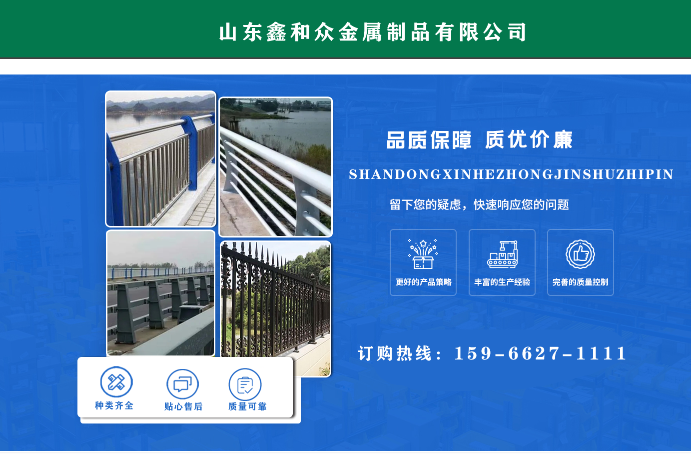 山東鑫和眾金屬制品有限公司主要產(chǎn)品有防撞護欄,橋梁護欄,道路護欄,河道護欄,不銹鋼護欄等護欄。提供設(shè)計方案,一站式定制,包您滿意價格優(yōu)惠,歡迎來電咨詢! 公司常年從事銷售護欄防撞護欄,橋梁護欄,道路護欄,河道護欄,不銹鋼護欄,橋梁鋼護欄,河道燈光護欄等。產(chǎn)品廣泛應(yīng)用于橋梁、河道、旅游景區(qū)、道路、公路、公園、小區(qū)、景觀、道路防撞等領(lǐng)域?! 」井a(chǎn)品均采用優(yōu)質(zhì)不銹鋼材料,符合相關(guān)標(biāo)準(zhǔn)。各種型號不銹鋼復(fù)合管及護欄,質(zhì)量嚴(yán)格把控。產(chǎn)品強度高、耐腐蝕、焊接牢固、抗沖擊、性能好,防撞護欄結(jié)構(gòu)簡單、美觀實用大方?! g迎前來訂購!...